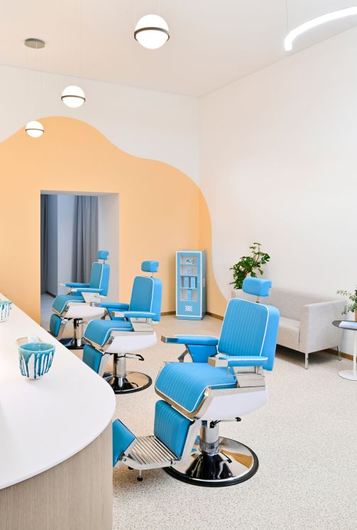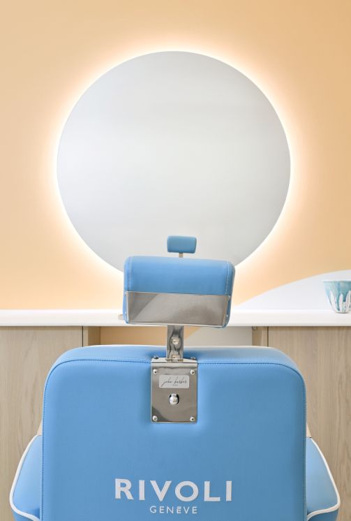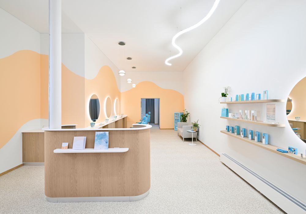 The curves, combined with the lighting fixtures, create a soft and calming atmosphere. The chosen colors and finishes add a touch of warmth and energy, while providing a contrast to the brand’s palette, highlighting the displayed products.