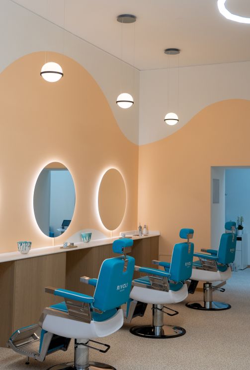 The curves, combined with the lighting fixtures, create a soft and calming atmosphere. The chosen colors and finishes add a touch of warmth and energy, while providing a contrast to the brand’s palette, highlighting the displayed products.