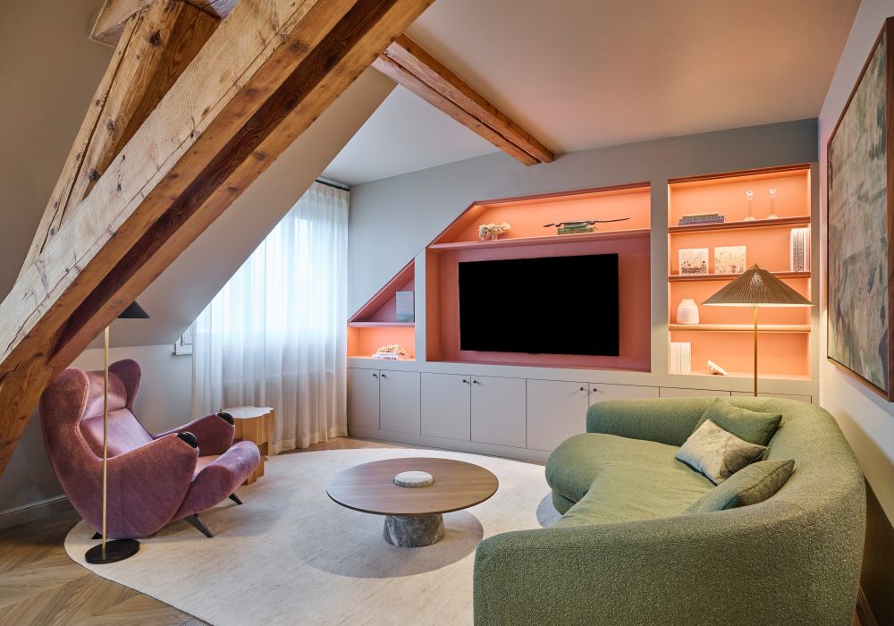 Two bedrooms and a living area benefit from sublime natural light and the charm of exposed beams. While it was essential to preserve and enhance the visible structure, the challenge was also to harmonize with it.